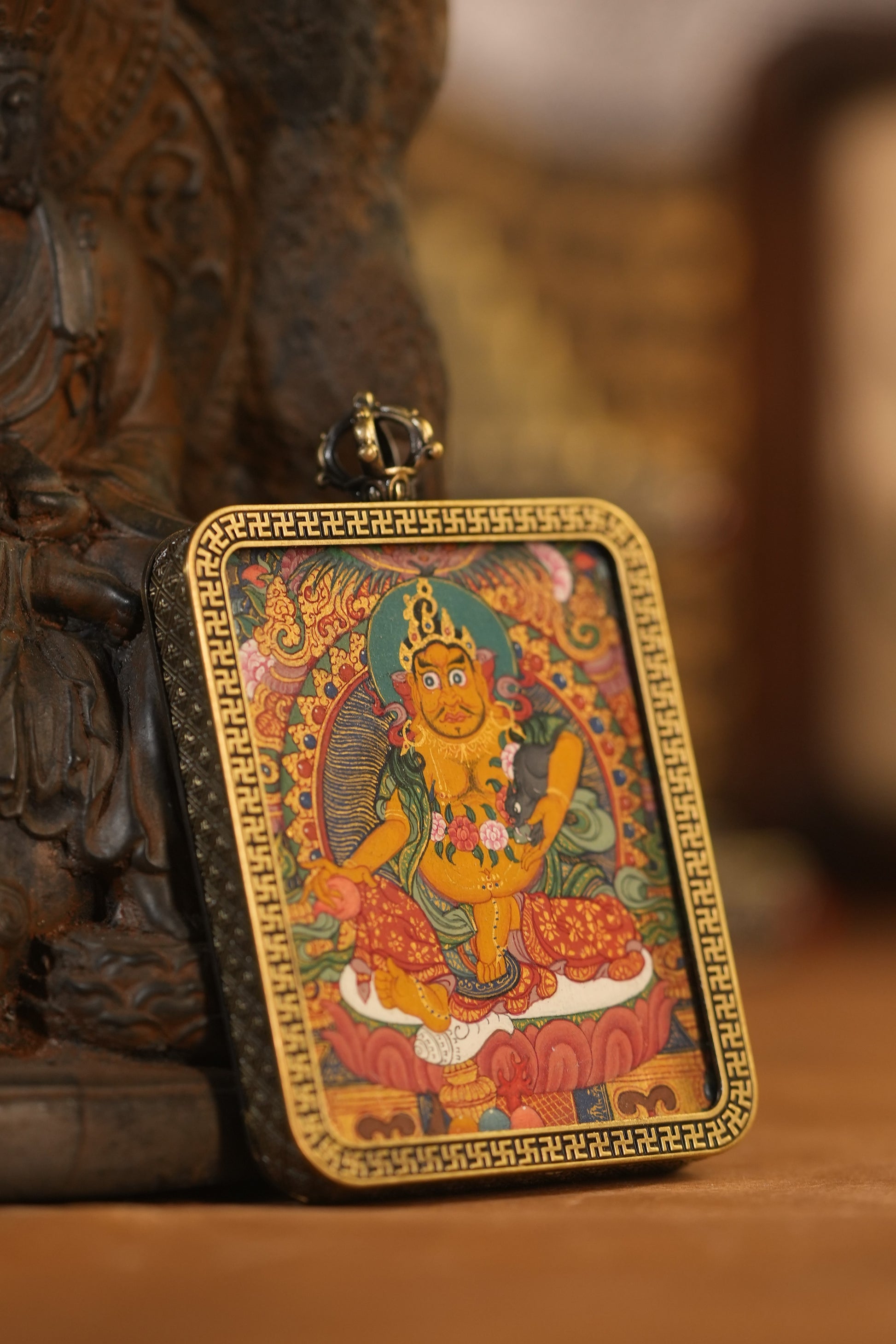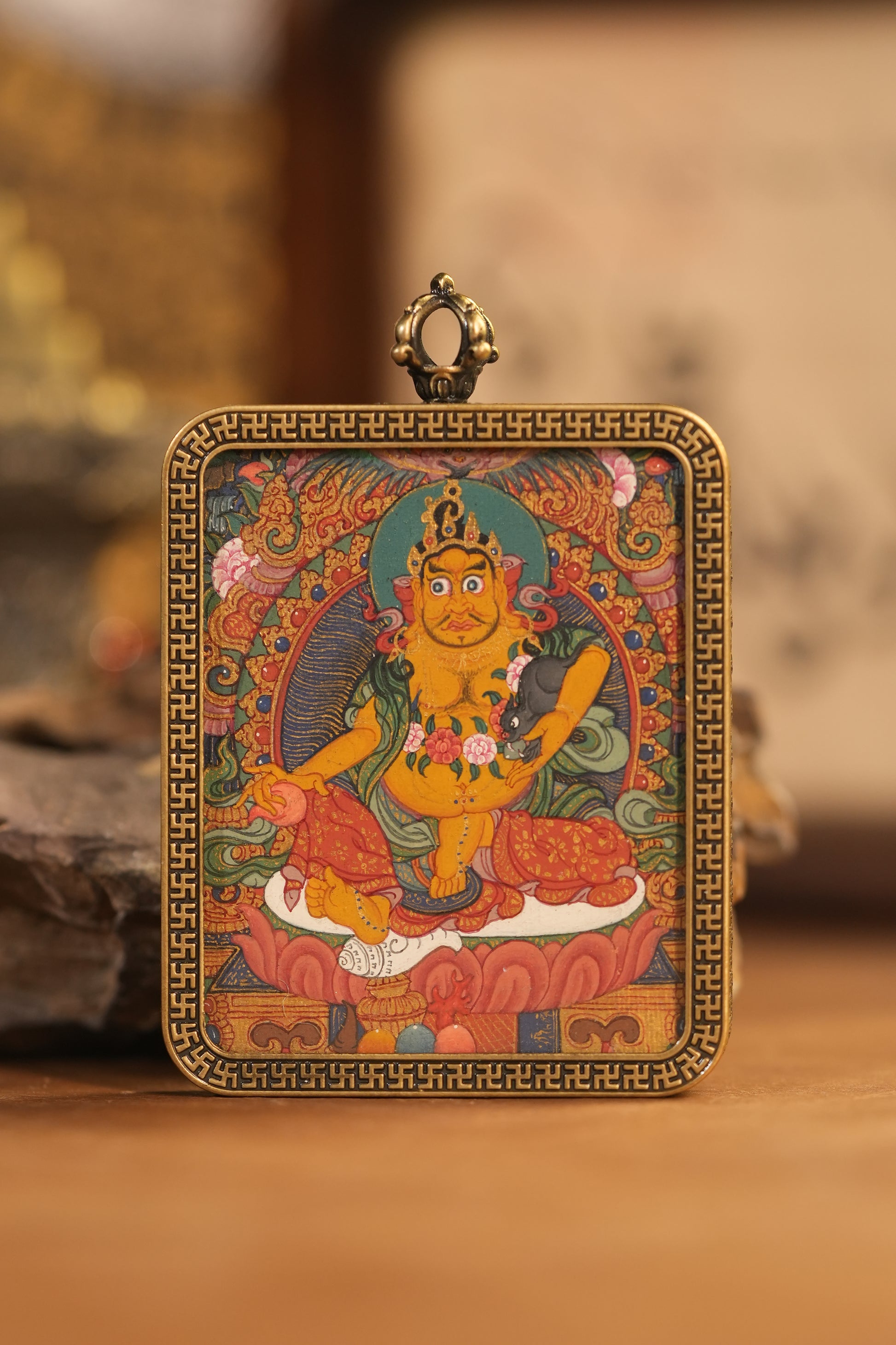 他身色金黄,头戴五佛宝冠,右手持摩尼宝珠,光芒可增添众生福报;左手抱吐宝鼠,源源不断吐出财宝。右脚踏白色海螺,寓意能入海取宝。