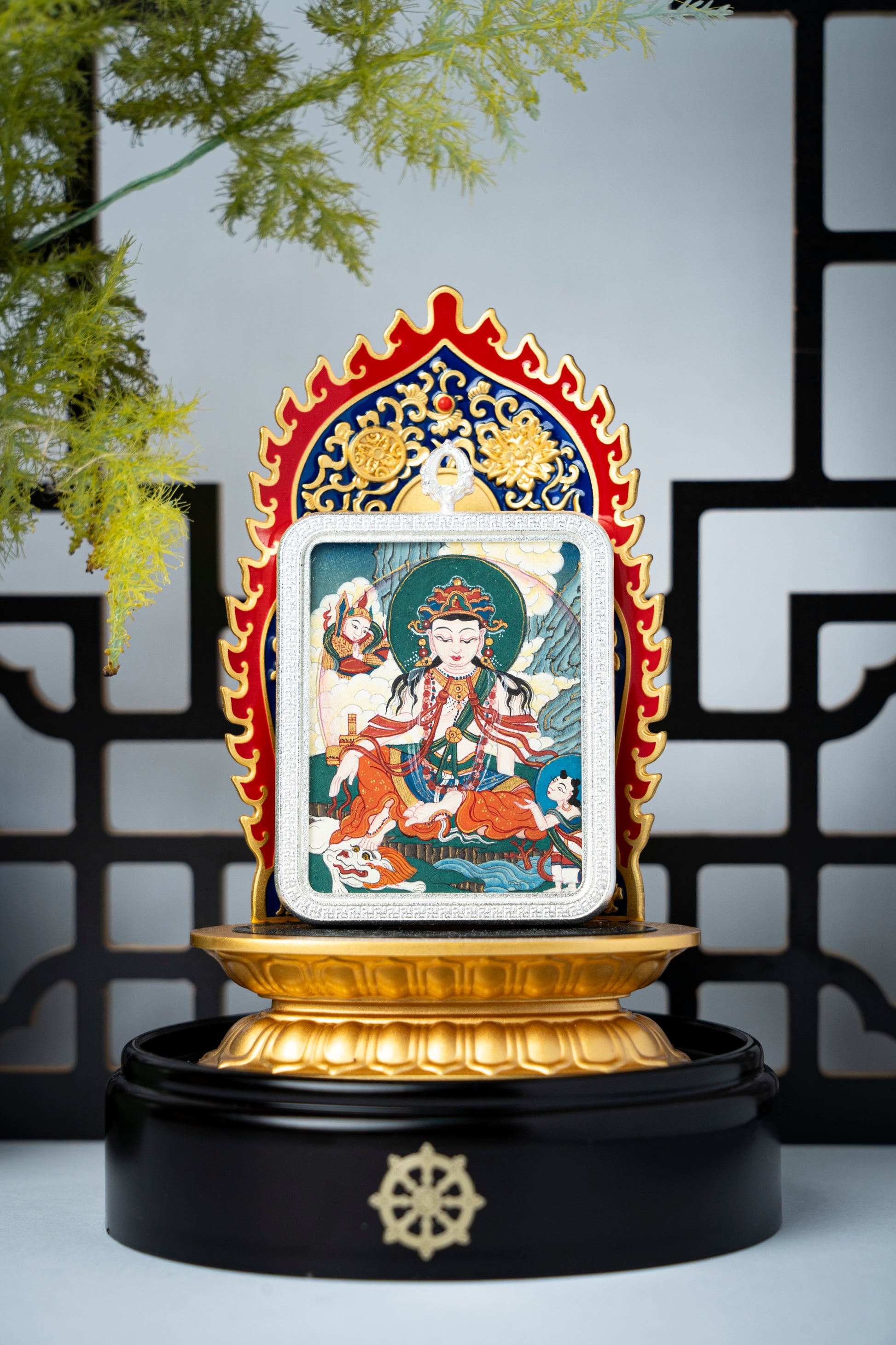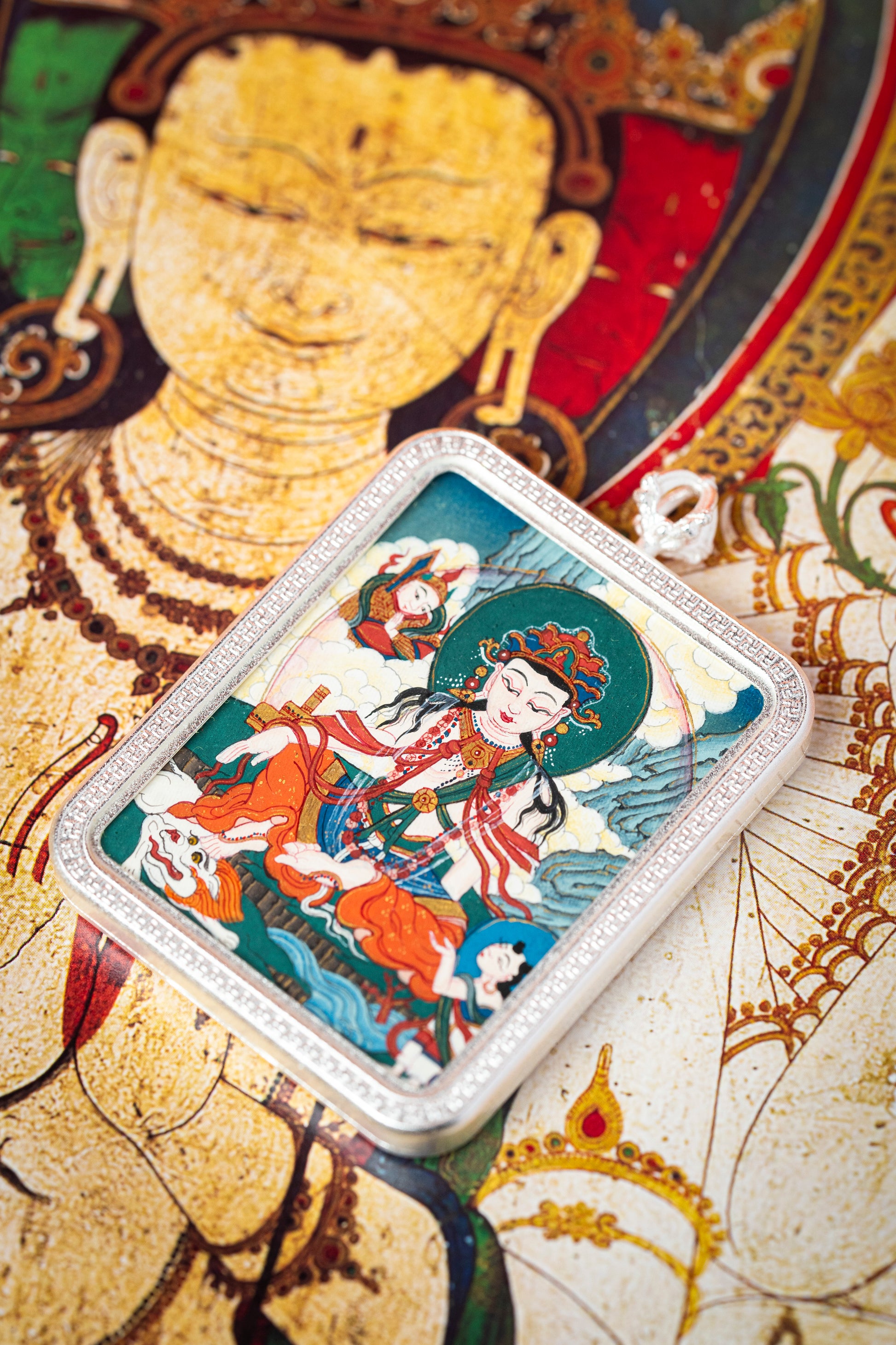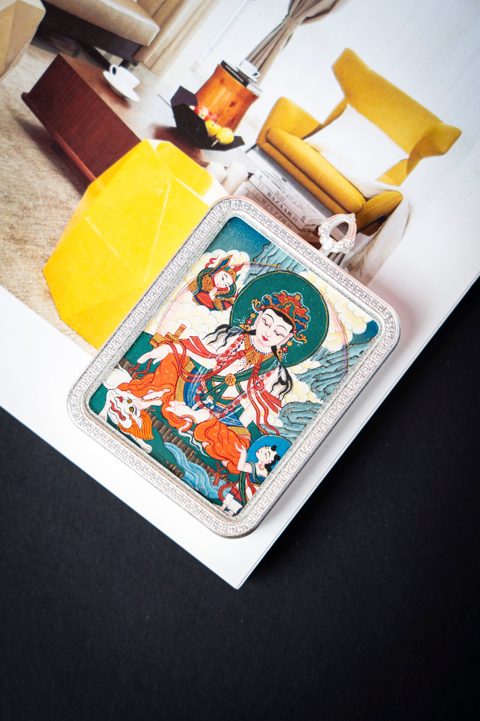 吊坠由资深唐卡画师严格依循传统法相,以天然矿物颜料精心手绘而成,线条流畅飘逸,设色清雅脱俗,完美呈现水月观音的空灵意境与慈悲神韵。更特别礼请寺院高僧如法开光加持,注入观音菩萨无上慈悲愿力与智慧光明。随身佩戴此圣像,寓意常沐观音慈光,护佑身心安宁,澄澈心性,启发智慧,远离怖畏与烦恼,于纷扰尘世中得一份自在清凉,是祈福安康、修身养性的珍贵随身禅境。